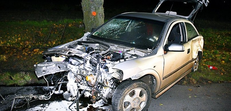 Jechał oplem bez uprawnień. Po uderzeniu w dwa drzewa skończył w szpitalu